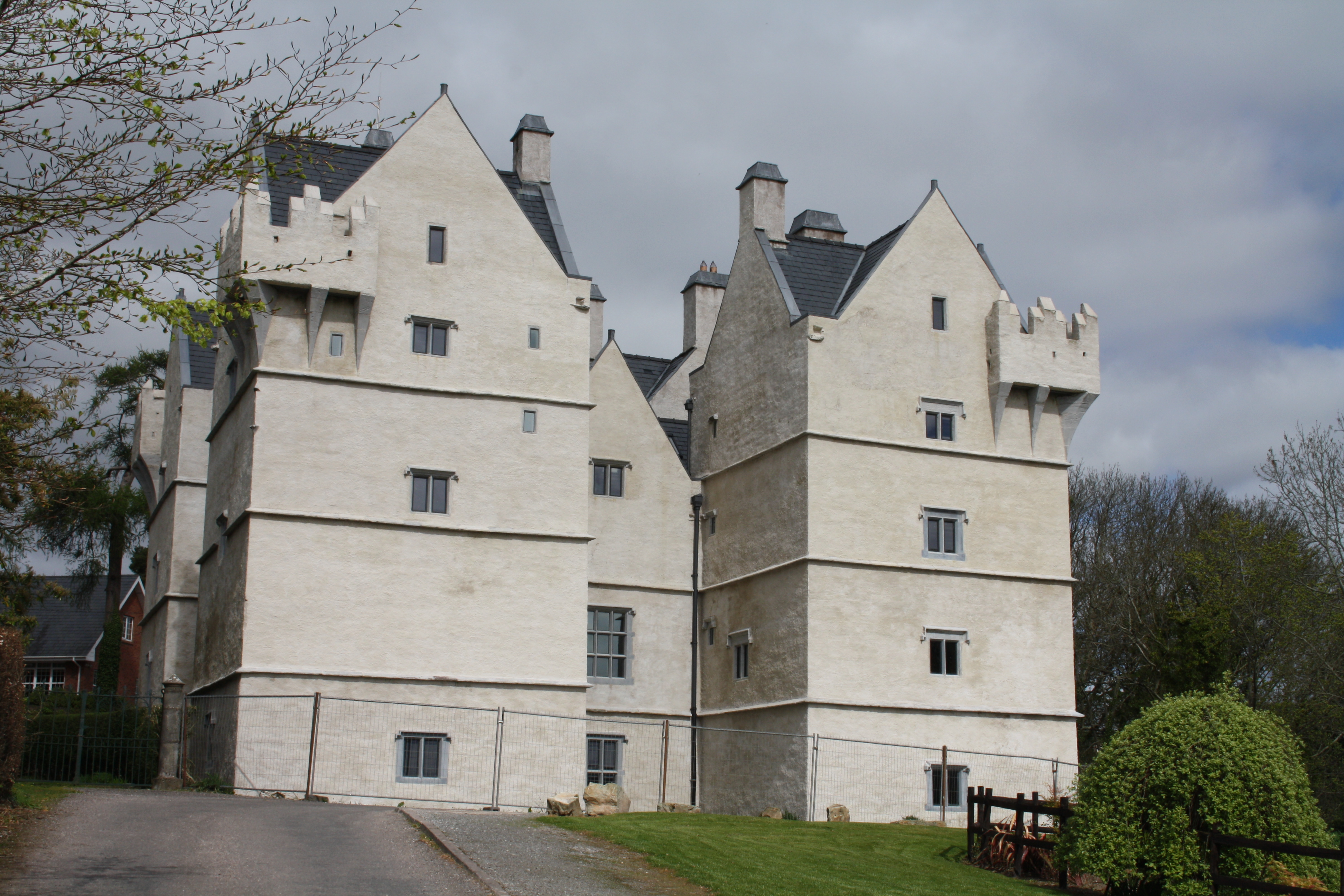 The exteriors of tower houses were colored grey-to-white (and/or possibly other colors), being covered with a lime-based rendering called “harling” (Lyttleton 30). The bleak, grey, rough stone exterior on most ruins today is therefore not indicative of their original appearance. A good example of harling today can be found on the recently restored fortified house at Monkstown, in a suburb of Cork city.