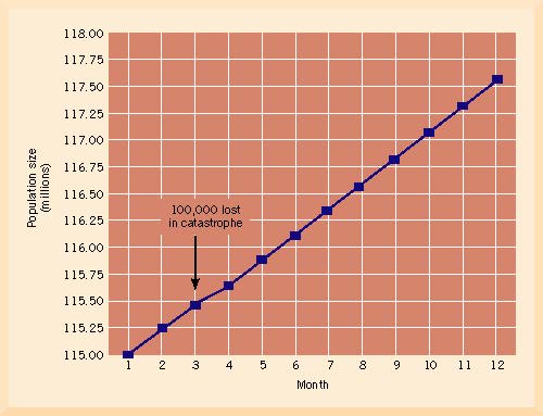 The human population is growing rapidly. Whereas the total human population on Earth was less than 250,000 people about 10,000 years ago during pre-agricultural times (or as many people as in a small city today), it is estimated that about 5.8 billion people will live on Earth by the end of 1997, many of them in developing countries where population growth rates are the greatest. For example, in Bangladesh (see Case Study), each year 2,860,000 people are added in excess of the number that died (the population there is growing by 2.4 % per year). Recently, a hurricane killed 100,000 people in Bangladesh (compare this number with the < 10 or so people killed in a hurricane when one hits the US coast). Afterwards, the population growth curve for Bangladesh barely showed a fluctuation because of this great natural disaster. (Figure 5.2). This underscores the magnitude of the population growth rate in Bangladesh. All over the world, people are being added to the planet at an average rate of 1.5 % per year, all the while consuming food, producing pollution, and causing changes to the environment. This may not seem like a lot, but the total number of people on Earth increases by about 87,000,000 people per year; that is roughly equivalent to the size of the population of Mexico. It has been said that this problem of overpopulation by humans is the greatest environmental problem facing the Earth. Because people in developing countries spend most of their time and money simply meeting their daily food requirements, no one in those countries with high population growth rates will be able to devote any effort to issues of protecting biological diversity, saving endangered species, conserving fisheries, or managing forests. In this chapter, the authors discuss the historical and current human population growth rate, the methods by which population growth is estimated, the impact of exponential growth rate, methods by which population control may be instituted, and finally, the controversy surrounding the methods of population control.