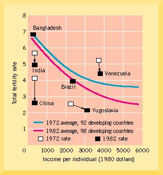 A natural and painless way to delay the age of first reproduction by women is by encouraging the education of females worldwide. This is the single most important factor in reducing the total fertility rate to replacement rate levels. Women who are educated and work outside the home have fewer children and make a greater income. There is a clear relationship between total fertility rate and income (Figure 5.10). As women make greater incomes, they have fewer children. And as they have fewer children, they make more money.